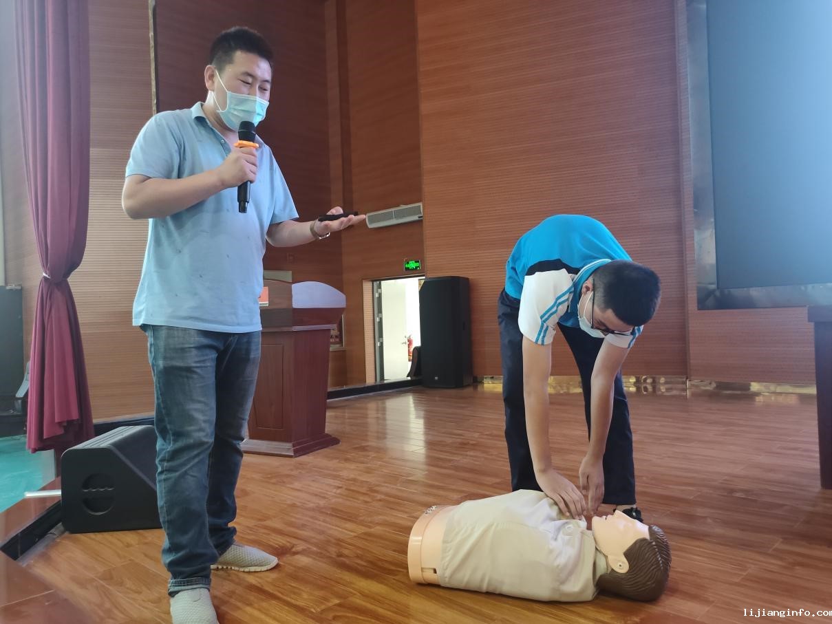 县红十字会讲师付亚斌老师用生动有趣的语言,真实的案例,采用了模拟现场的互动方式为大家讲解了心肺复苏、拨打报警电话技巧和遇到突发情况时自救和互救的方法、创伤包扎等急救知识,还对心肺复苏、意外事件处置、创伤包扎等应急救护方法进行了现场操作演练。