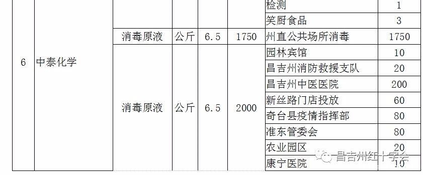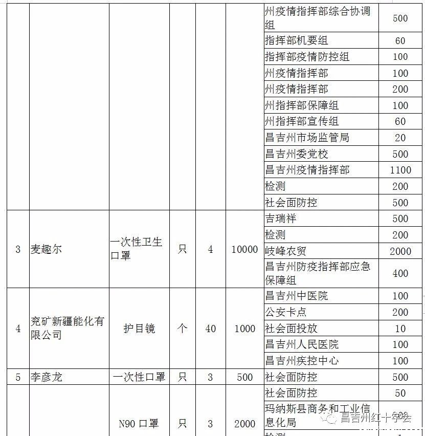 现将昌吉州新冠肺炎疫情防控工作指挥部接受社会捐赠物资第一批分配情况公示如下: