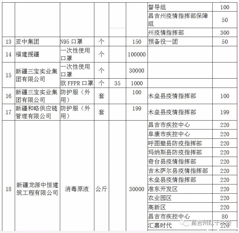 昌吉州新冠肺炎疫情防控工作指挥部发放捐赠物资统计表