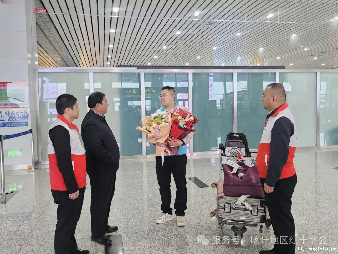 3月26日清晨,喀什地区第12位成功捐献造血干细胞志愿者王鹏同志乘机抵达喀什俫宁国际机场。喀什地区、喀什市红十字会负责同志和工作人员送上鲜花,热烈欢迎王鹏同志传递生命火种载誉归来。
