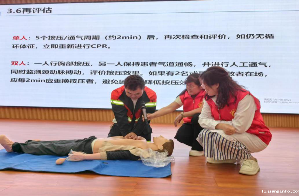 培训采用理论知识讲解和实际操作相结合的方式进行,培训师资结合日常生活工作,借助教学模拟人进行示范,详细讲解心肺复苏、海姆立克急救法及外伤包扎等急救知识。