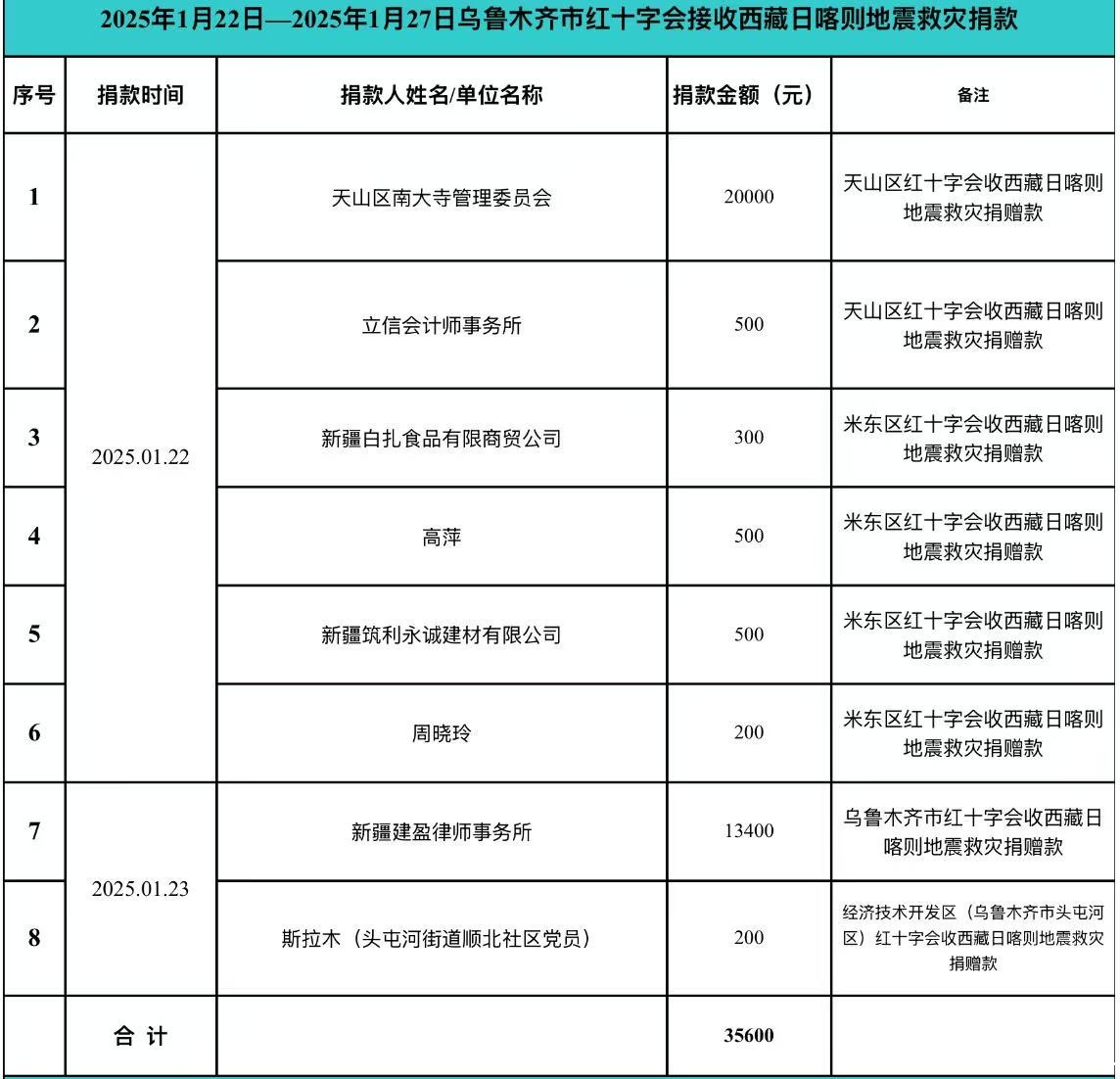 2025年乌鲁木齐市红十字会接受西藏日喀则地震救灾捐款公示(1月22-1月27日)