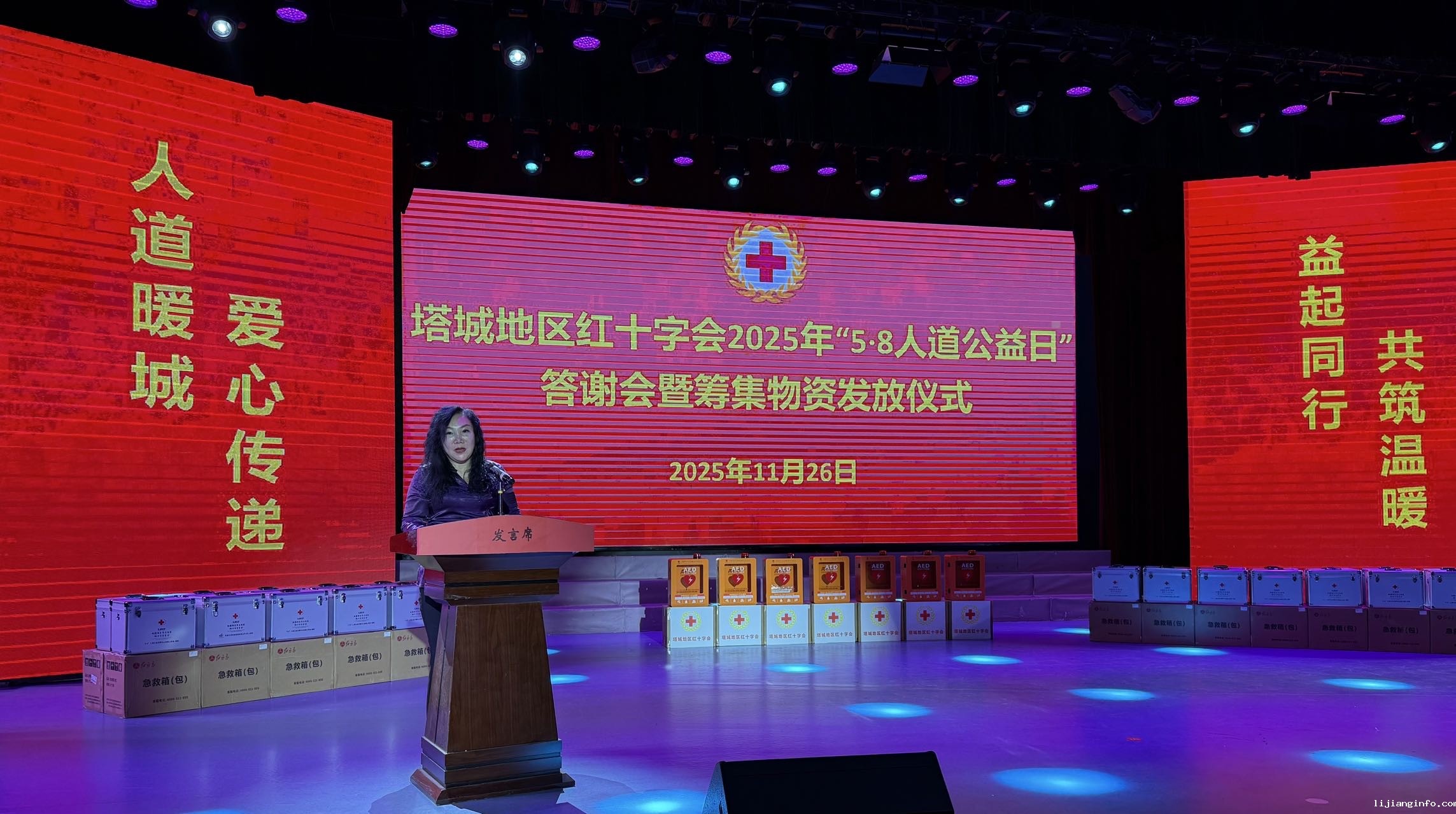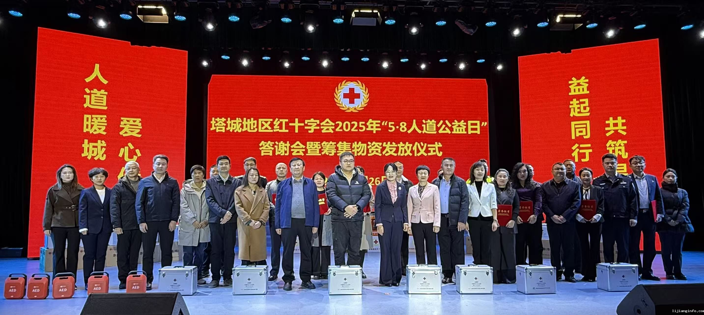11月26日下午,塔城地区红十字会在地区新时代文明实践中心隆重举行2025年“5.8人道公益日”答谢会暨筹集物资发放仪式。地委、行署、塔城市委、地直有关单位领导及捐赠单位代表、受赠单位代表、志愿者等150余人参加活动。