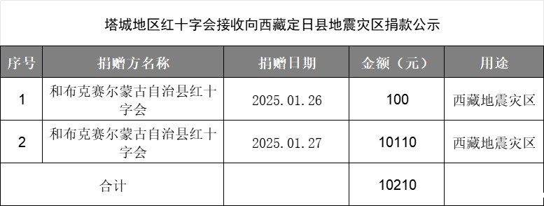 塔城地区红十字会接收向西藏定日县地震灾区捐款公示(1月26日-2月4日)