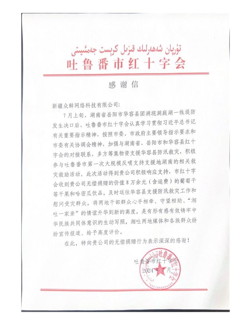 为表示对新疆众鲜网络科技有限公司无偿捐赠的人道主义行为的肯定和感谢,市红十字会向该公司发放捐赠证书并代表市委致感谢信。