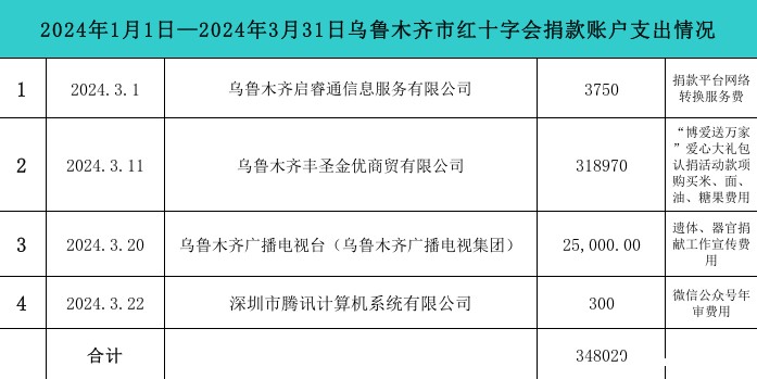 2024年1月1日—2024年3月31日乌鲁木齐市红十字会捐款账户支出情况公示